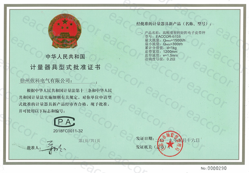 熱烈祝賀徐州依科電氣有限公司專利技術(shù)高精度智控矩陣電子皮帶秤EACCOR-B159獲得0.2級(jí)計(jì)量器具型式批準(zhǔn)證書(shū)?。?!