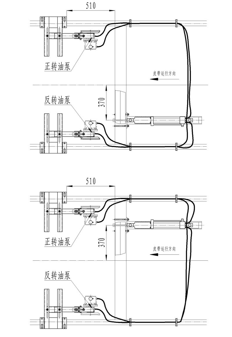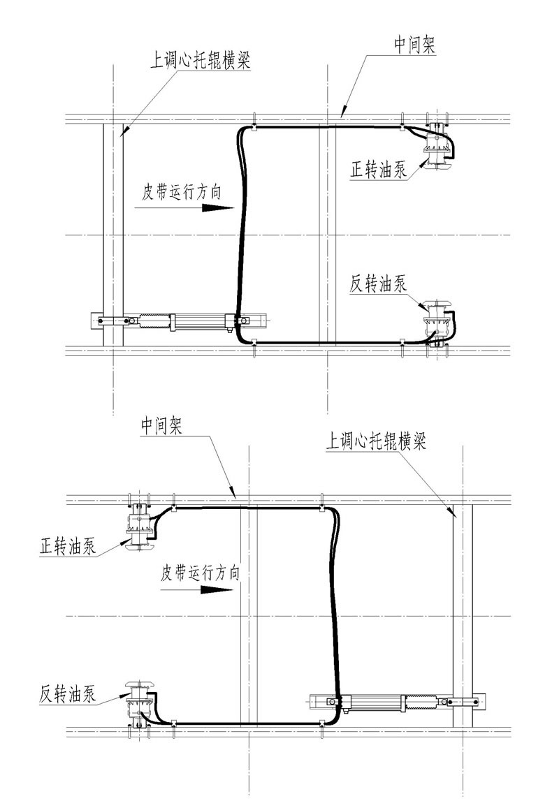 全部安裝完成后,模擬皮帶跑偏,輪流盤動左右檢驅(qū)輪,讓油缸帶動調(diào)心托輥旋轉(zhuǎn),循環(huán)5次。